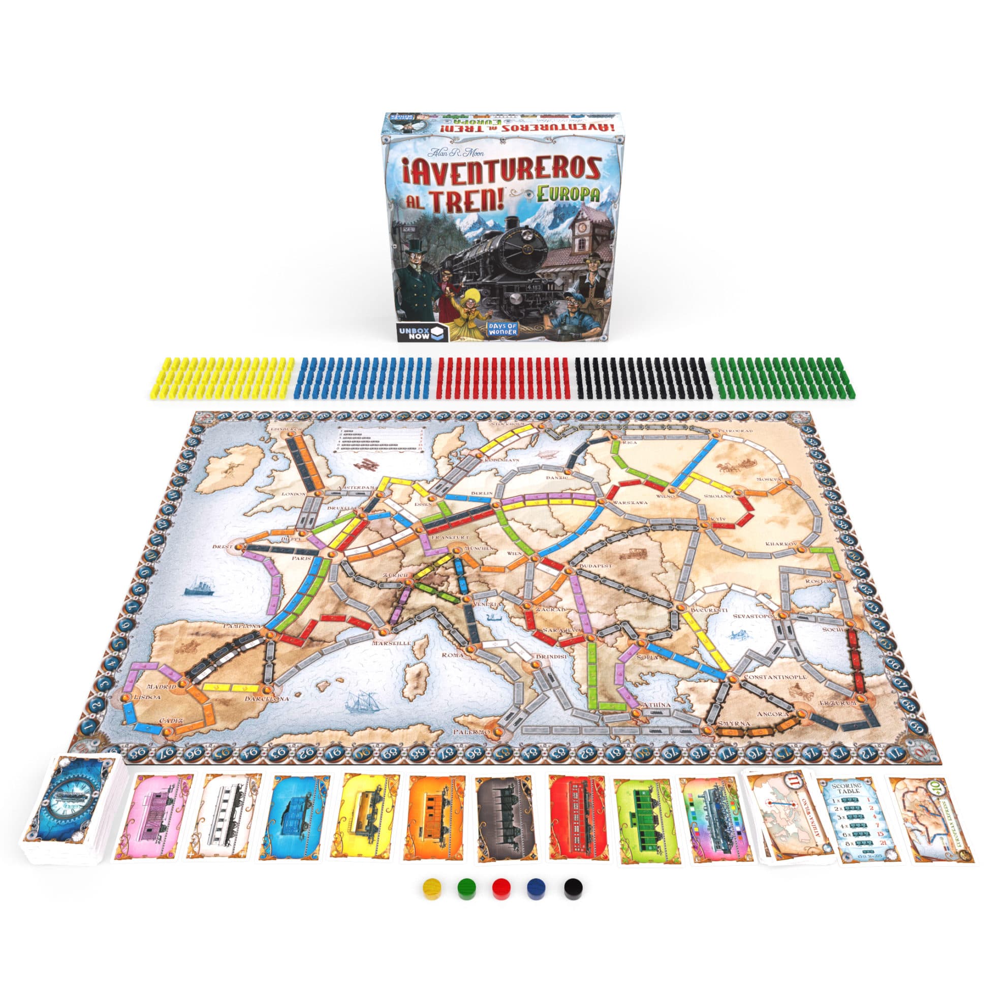 ¡Aventureros al tren! Europa es un juego de aventuras en tren en el que los jugadores cubren recorridos conectando ciudades por toda Europa. ¡Cumple tus objetivos y no pierdas de vista los recorridos de tus oponentes! ¡Pasajeros al tren!